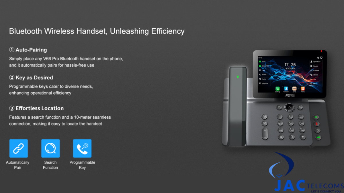 Fanvil V66 Pro Prime Business Phone integrates audio and video communication and is equipped with a programmable Bluetooth wireless handset, supporting auto-pairing and locating. Made with antimicrobial materials, the V66 Pro features a 7-inch rotatable IPS touch screen, built-in 2.4G/5G Wi-Fi (Wi-Fi 6), and Bluetooth 5.4, delivering superior communication for high-end business users.